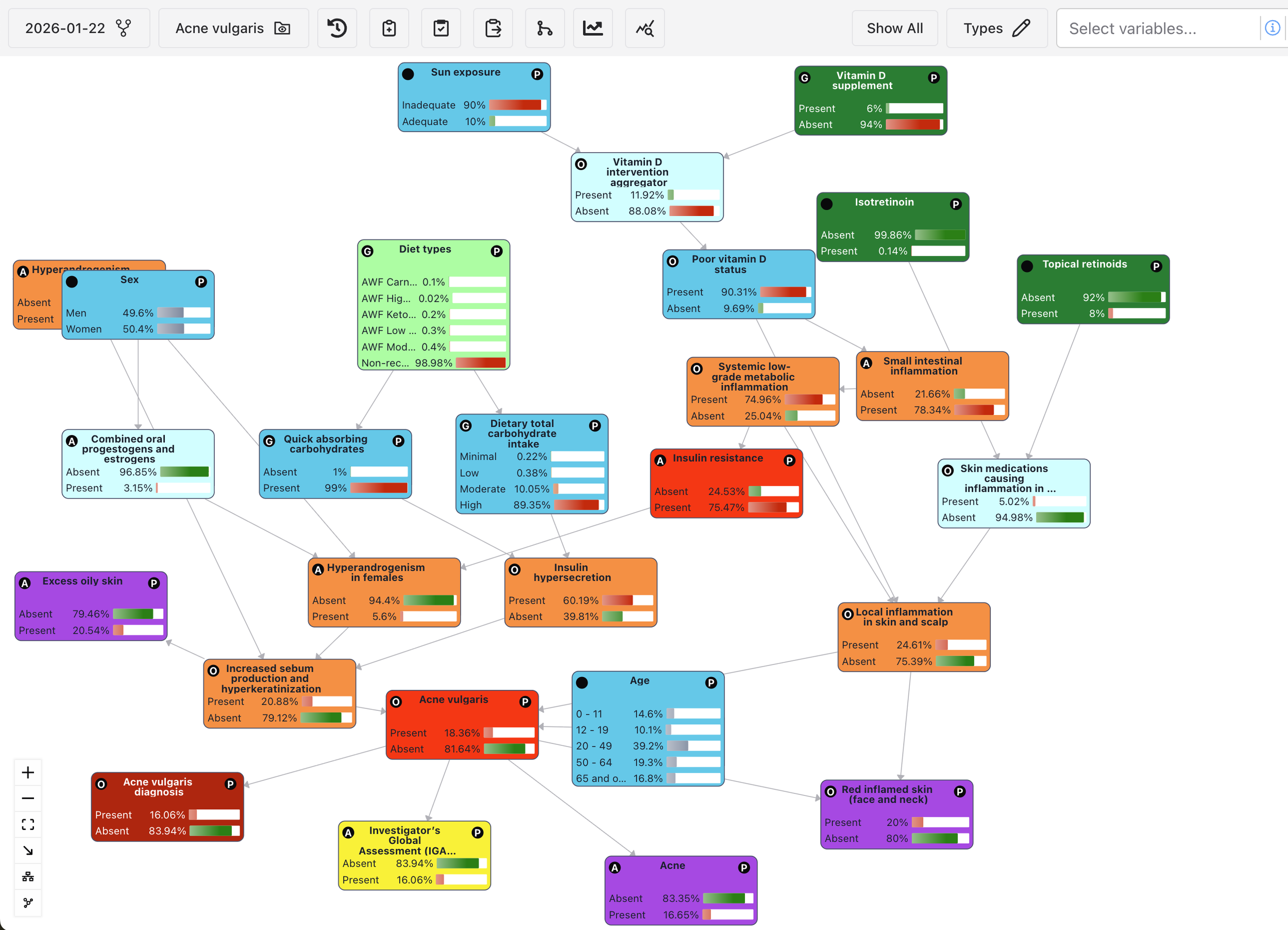 The knowledge base of our Ancestra Health app is a Bayesian Network[*], a probabilistic graphical model that represents many hundreds of variables, their causal relationships via a directed acyclic graph, and their conditional dependencies expressed as probabilities. Our Bayesian network is trained on thousands of so-called requirements, extracted from or inferred from tens of thousands of scientific papers. The requirements used for training have this structure: the conditional probability of a state of A variable, given the observation of a state of B variable, is X%: